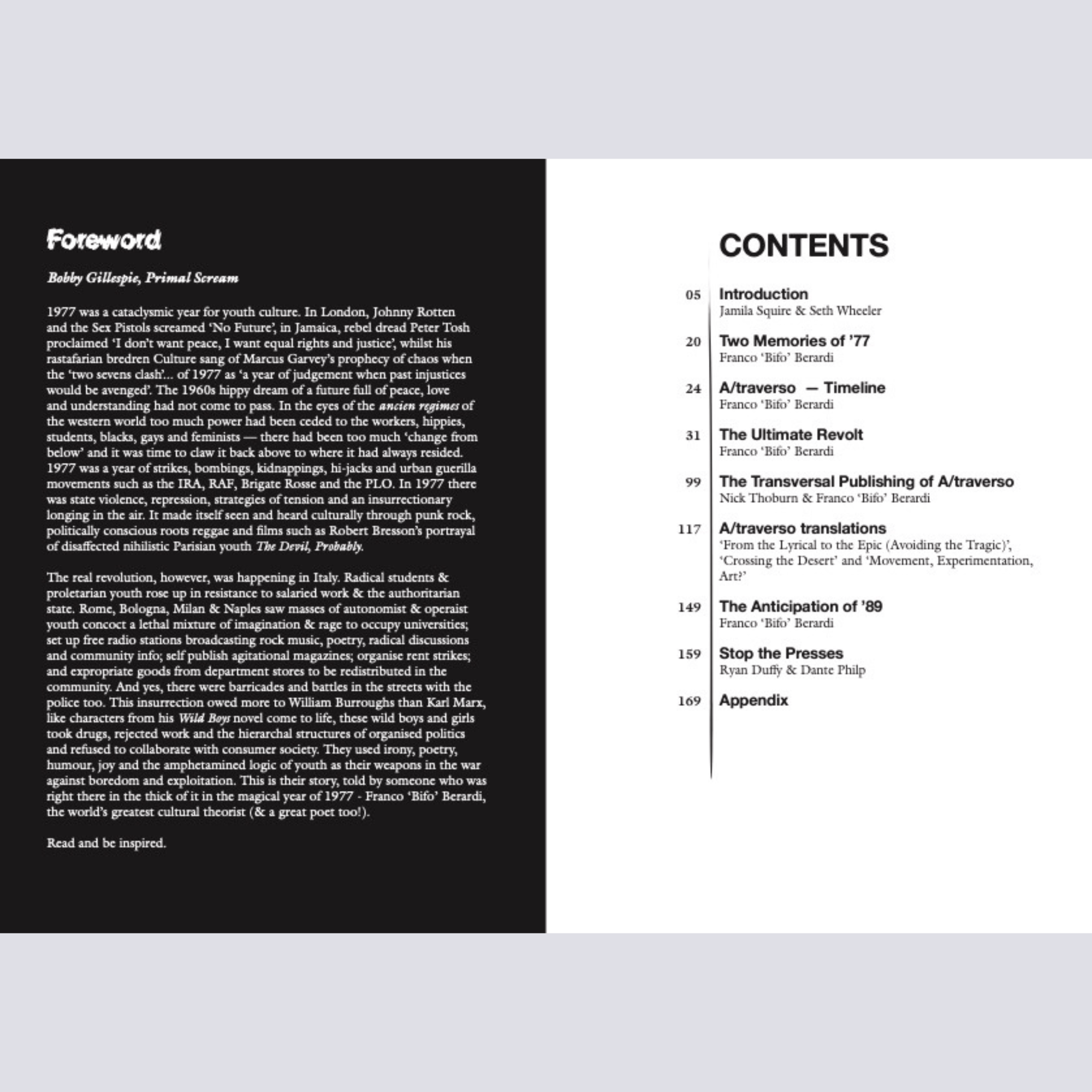 In 1977 youth revolts spectacular in their intensity, creativity and violence would send shockwaves throughout Italian society. These rebellions, belonging to the autonomia movement, were characterised by a mass refusal of wage-labour and powered by novel experiments in communication, in particular the printed word. Hundreds of revolutionary newspapers known as ‘movement sheets’ would circulate Italy during those years, acting as little machines to produce political subjectivity. This book contains the recollections of the autonomist militant, philosopher and media theorist Franco ‘Bifo’ Berardi on autonomia and the tumultuous events of ’77, told through the pages of A/traverso, the Bolognese movement sheet he produced with others between 1975 - 1981. In texts translated into English for the first time, presented alongside extensive archival material and stunning photographs, this book explores the subversion, exuberance and joy of the movement of ’77, while raising important questions about the role of creative collectivity and experimental communication for militants today.